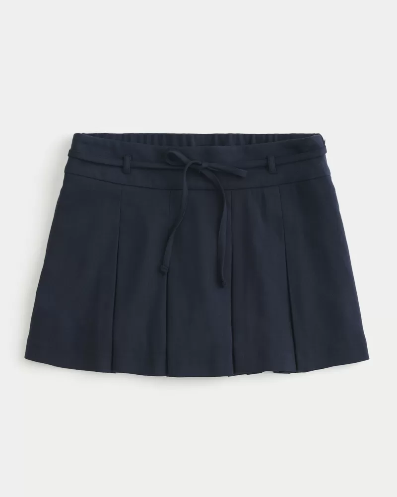 A cute and comfy mini skort designed with a mid-rise waist and classic pleats. Tie waist, hidden shorts, pockets.