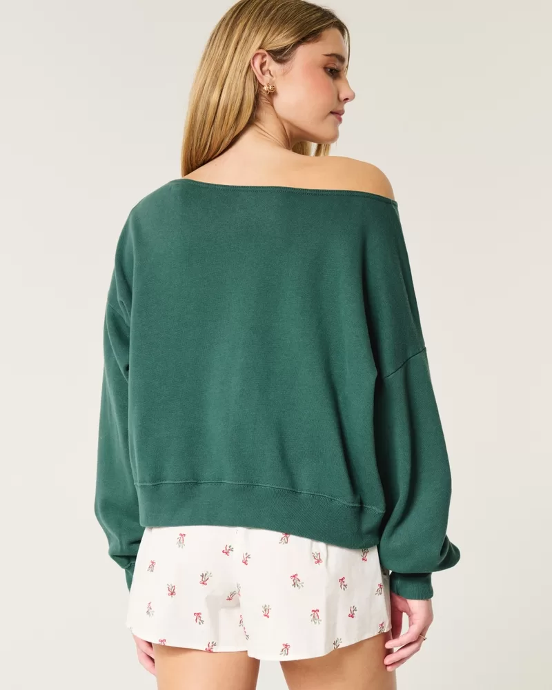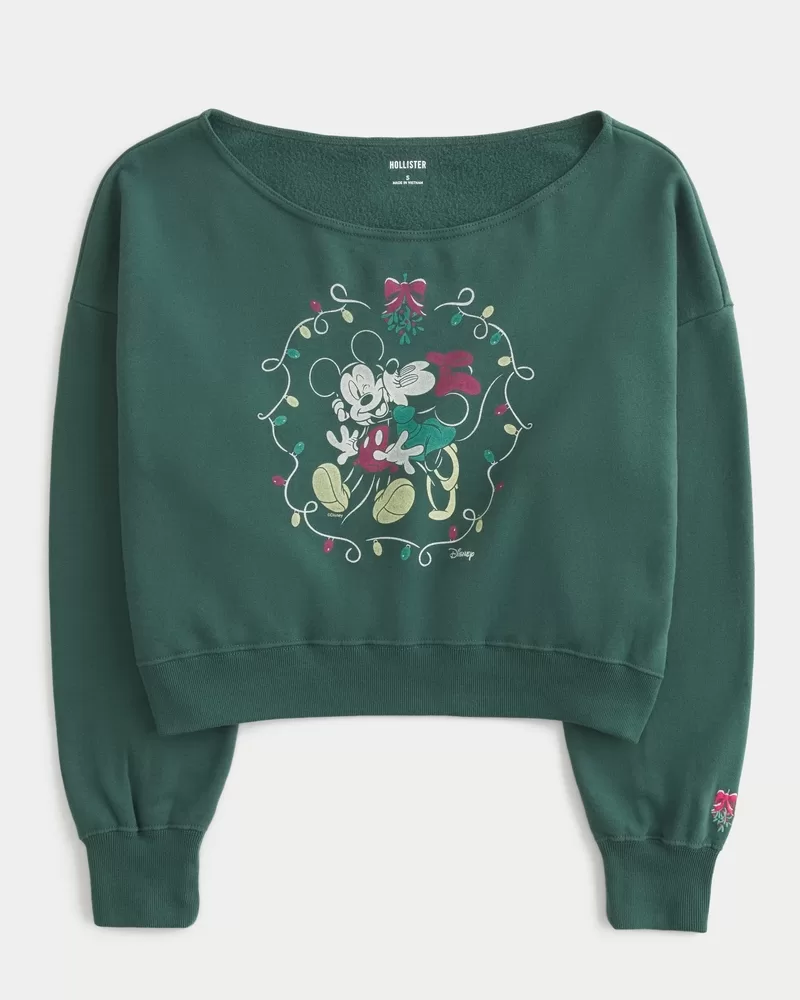 This cozy and super soft fleece sweatshirt features official Disney-licensed Mickey and Minnie Mouse print graphics and an off-the-shoulder neckline. Long sleeves, embroidered mistletoe detail at left sleeve, mini silhouette. Imported.