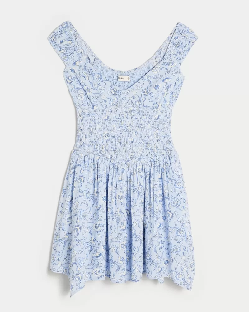 Super soft and pretty, this off-the-shoulder mini dress features pockets and a smocked waist. Asymmetrical hem. Imported.