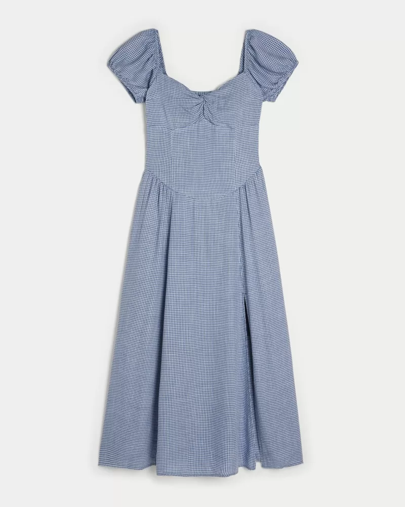 A flowy and super soft maxi-length dress designed with a drop waist and on-or-off-the shoulder neckline. Puff sleeves, twist detail at center bust. Imported.