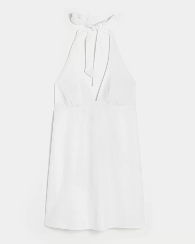 Flowy and super soft, this linen-blend dress features halter straps and an open back detail. Mini length. Imported.