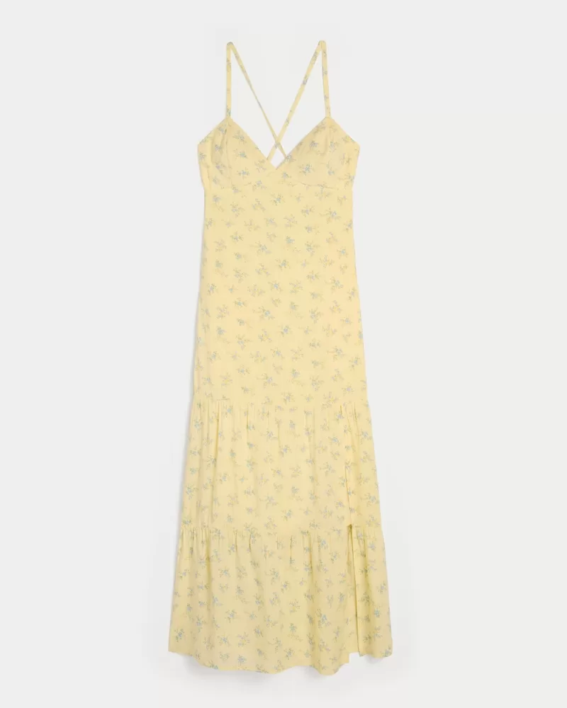 A pretty and super soft maxi-length dress with cross-back straps and an open back detail. Split hem detail.