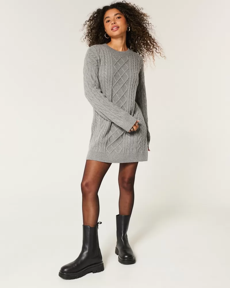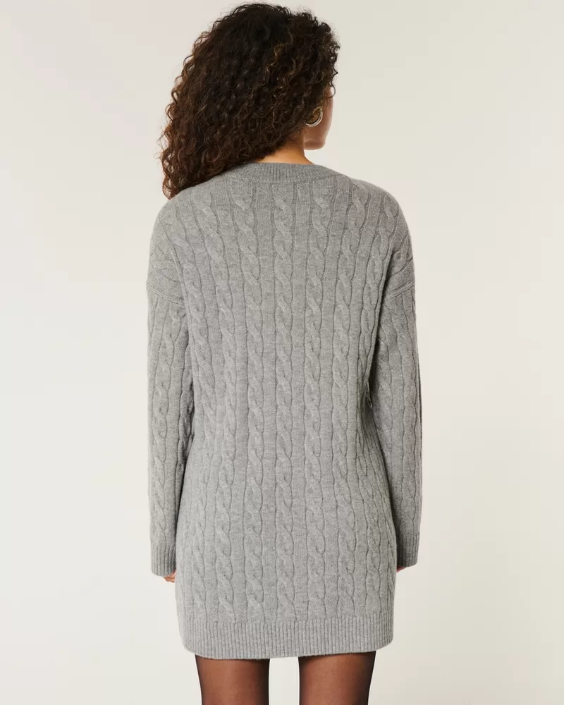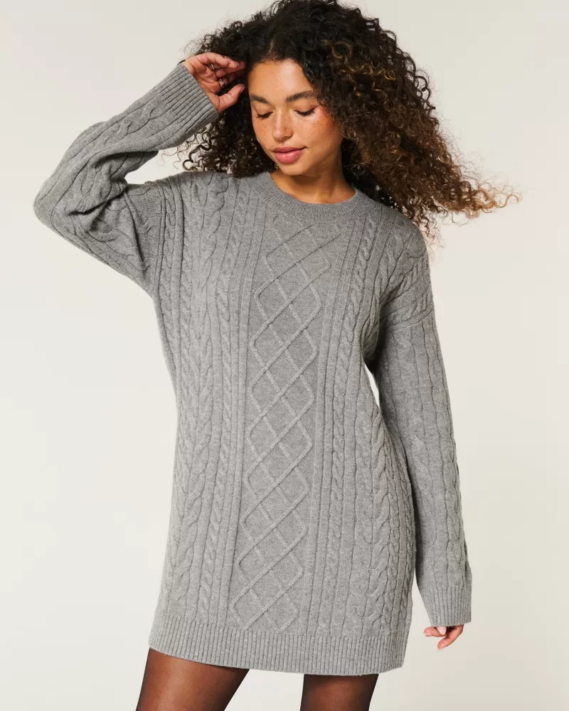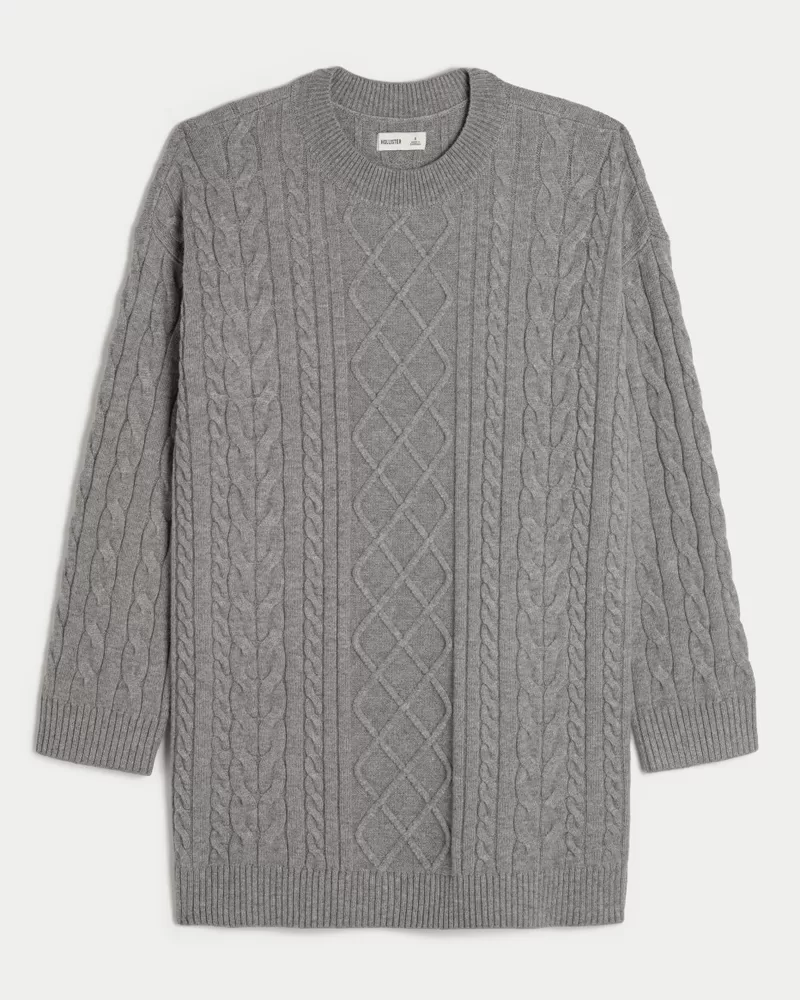 An unbelievably cozy and super soft sweater dress with classic cable-knit patterns, a crew neckline and long sleeves. Ribbed trims. Oversized Fit. Imported.