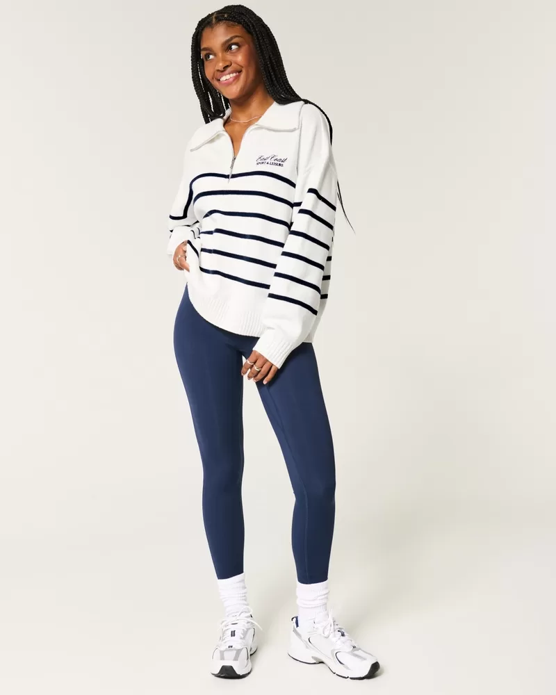 A cozy and super soft sweater with a foldover collar and half-zip closure. Ribbed trims, long sleeves, embroidered East Coast Sport & Leisure graphic embroidery at the left chest. Oversized Fit. Imported.