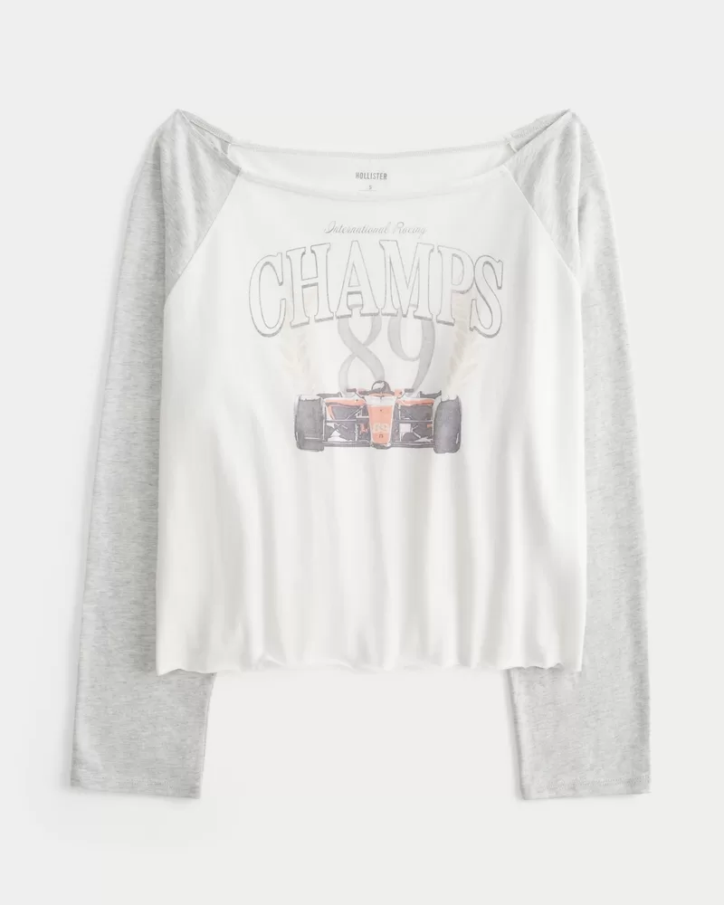 A super soft 100% cotton tee featuring racing print graphics and slouchy off-the-shoulder neckline. Long raglan sleeves. Oversized Fit. Imported.