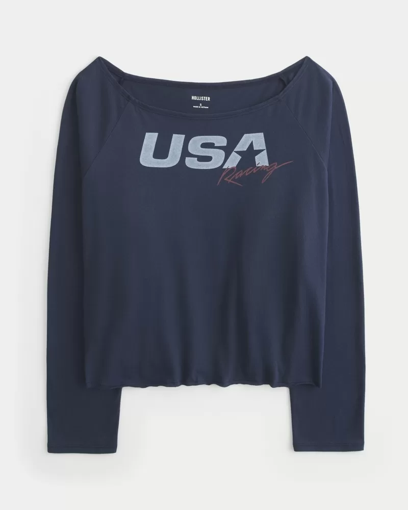 A super soft 100% cotton tee featuring USA Racing print graphics and slouchy off-the-shoulder neckline. Long sleeves. Oversized Fit. Imported.