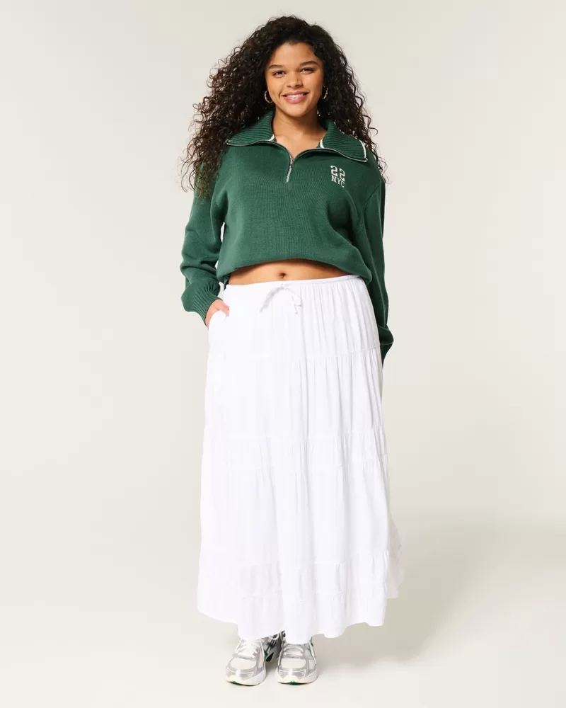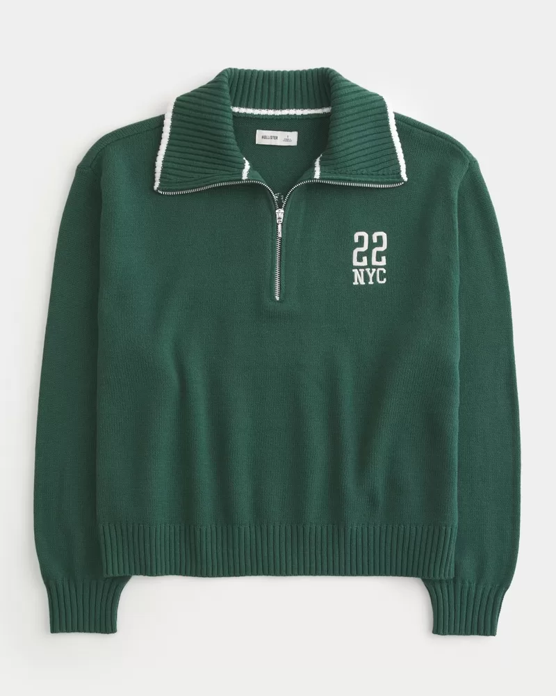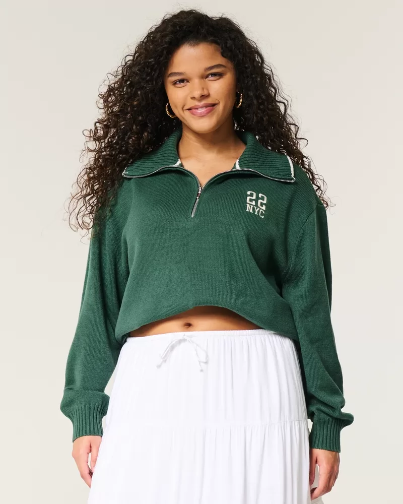 A cozy and super soft sweater featuring NYC graphic embroidery at the left chest and a star intarsia graphic at the back. Foldover collar with a half-zip closure, ribbed trims, long sleeves, longer length. Oversized Fit. Imported.