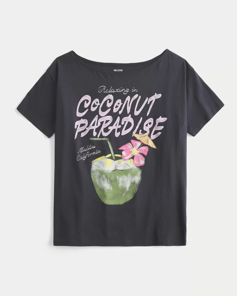 Oversized Off-the-Shoulder Coconut Paradise Graphic Tee