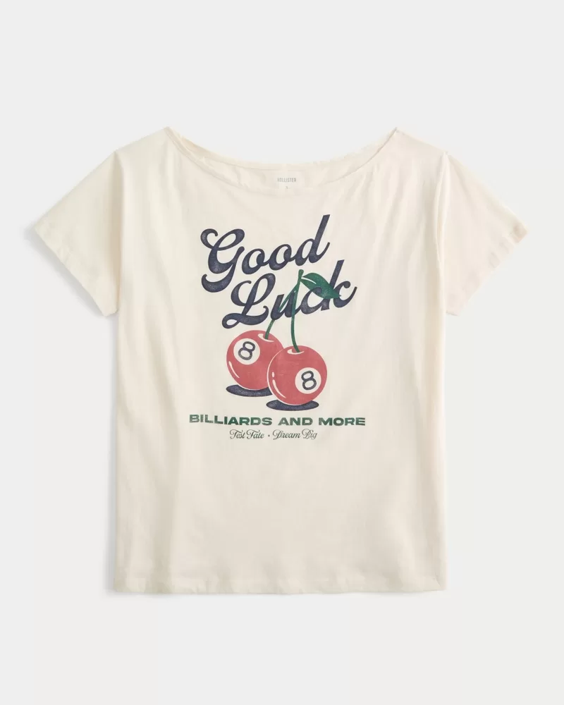 This super soft 100% cotton tee features Good Luck billiards print graphics and an off-the-shoulder neckline. Short sleeves, longer length. Oversized Fit. Imported.