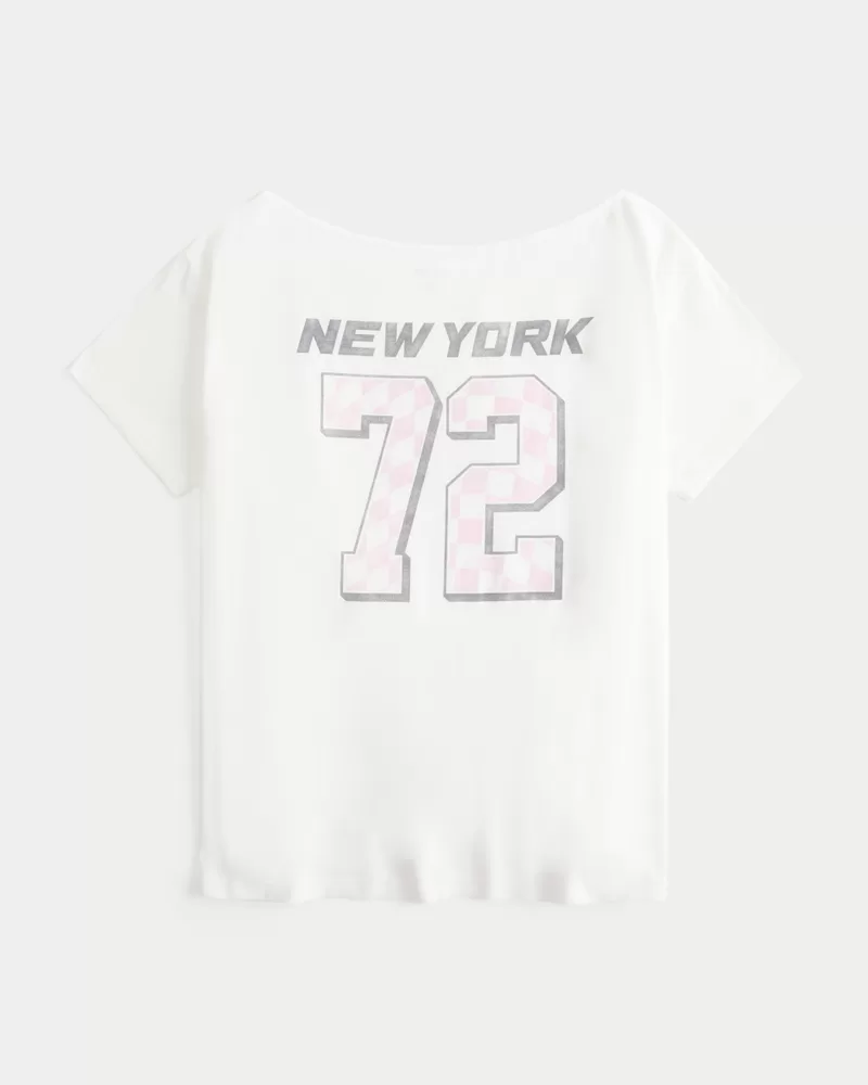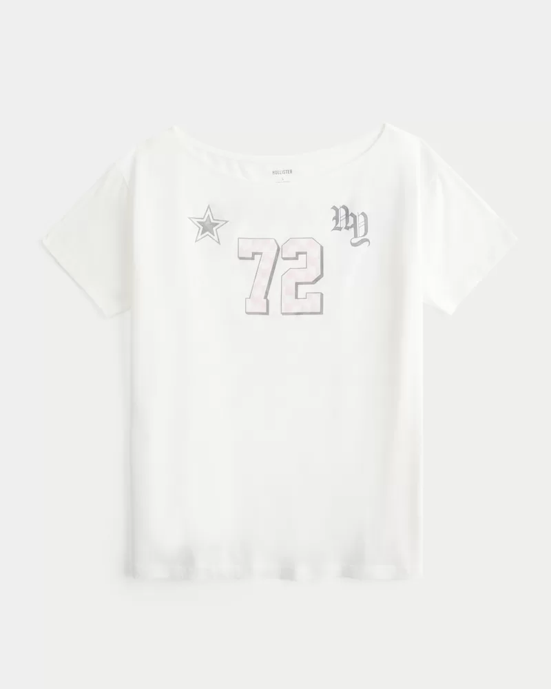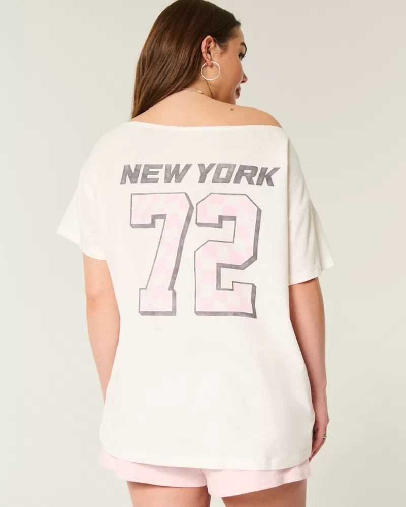 This super soft 100% cotton tee features a number print graphic and off-the-shoulder neckline. Short sleeves, longer length. Oversized Fit. Imported.