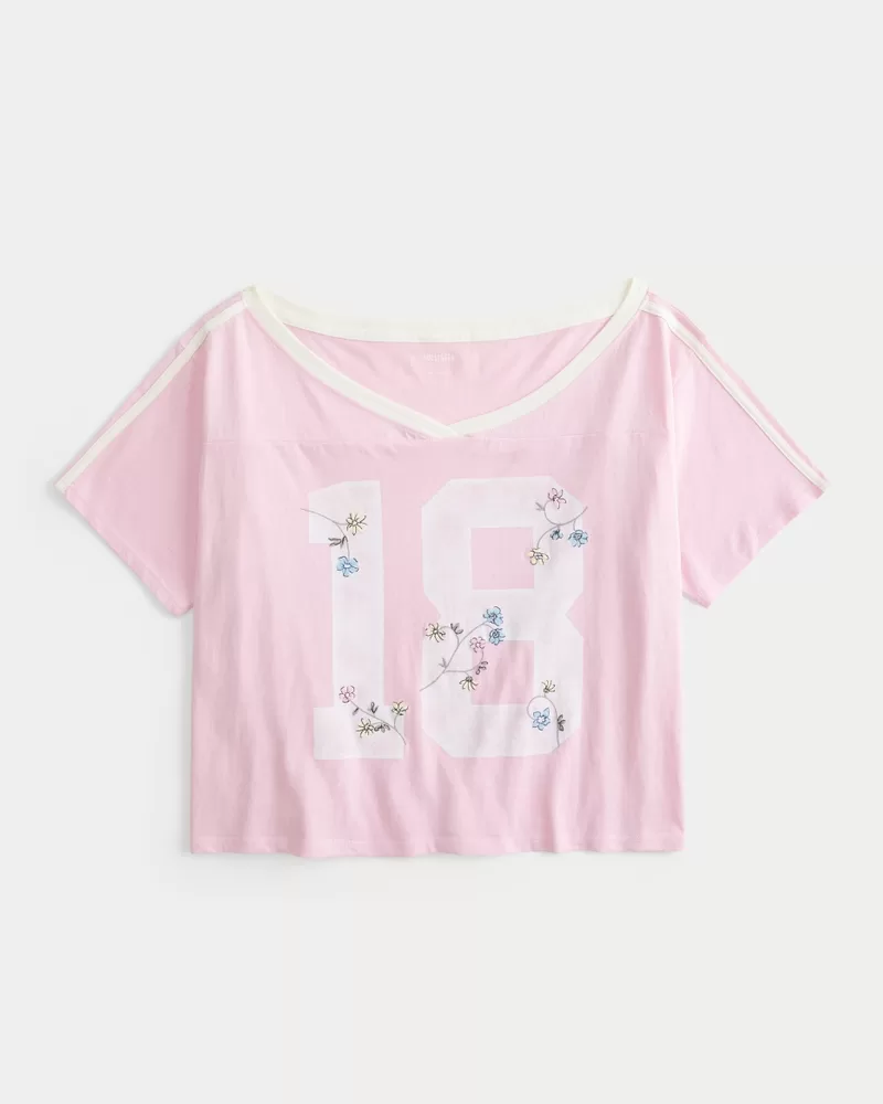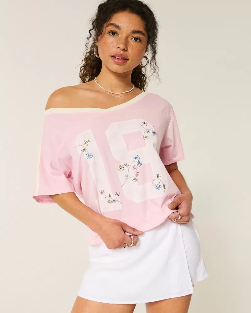 A super soft tee featuring a varsity-style number print graphic with embroidered floral details and an off-the-shoulder neckline. Short sleeves. Oversized Fit. Imported.