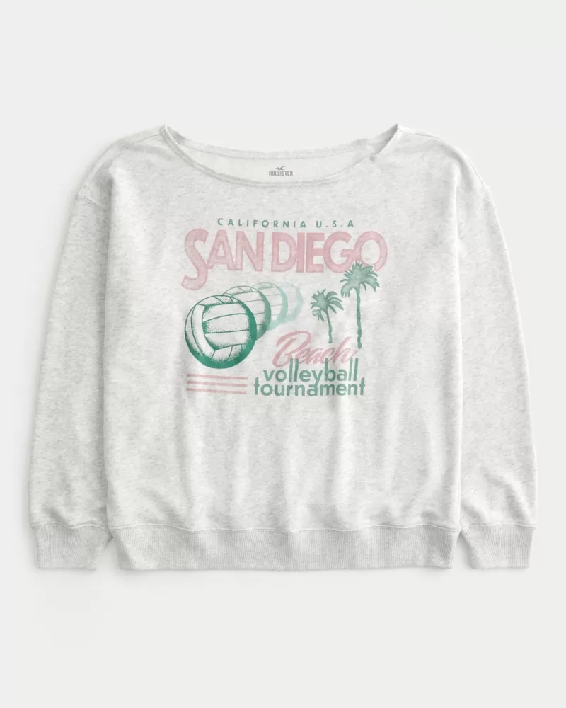 This super soft fleece sweatshirt features San Diego Volleyball print graphics and an off-the-shoulder neckline. Long sleeves. Oversized Fit. Imported.