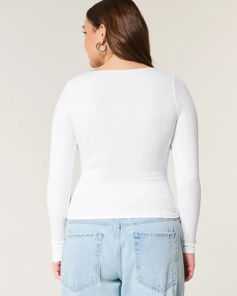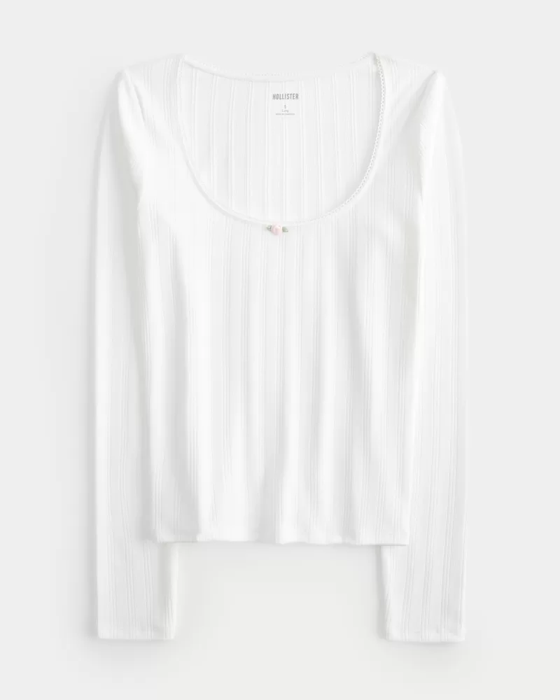 A cute and cozy long-sleeve top in super soft fabric with a seamless look and feel and pointelle texture. Scoop neckline with pretty rosette detail and scalloped trim. Slim Fit.