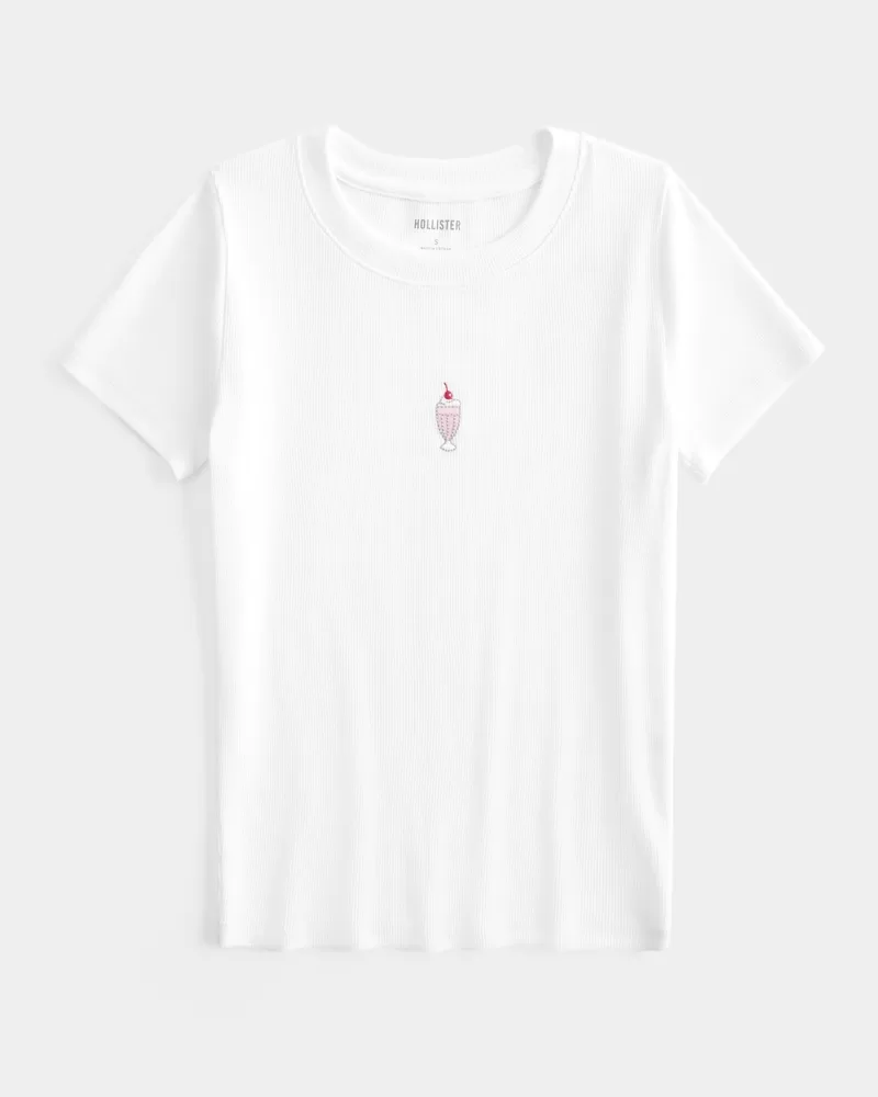 A cute and cozy baby tee in super soft ribbed fabric featuring an embroidered milkshake graphic, crew neckline and short sleeves. Longer length. Slim Fit. Imported.