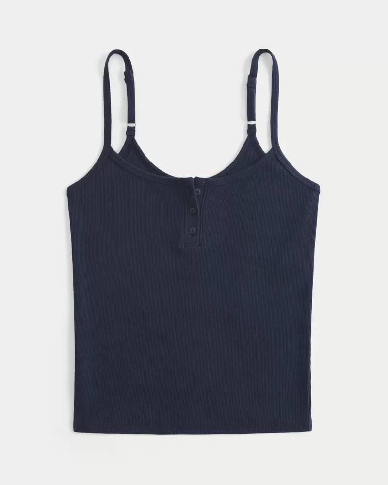 A super soft and comfy cami in ribbed fabric, designed with a notch button henley placket and adjustable straps. Slim Fit.