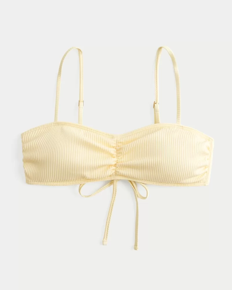 A super cute bikini top in soft ribbed swim fabric with a scoop neckline and cinched detailing at the center. Adjustable straps, tie back closure. Imported.