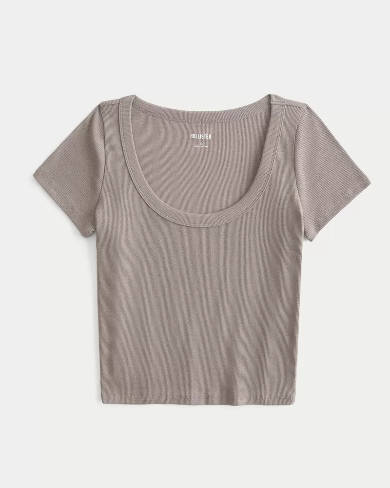 Cute and super soft, this top features a scoop neckline and ribbed fabric. Short sleeves. Slim Fit.