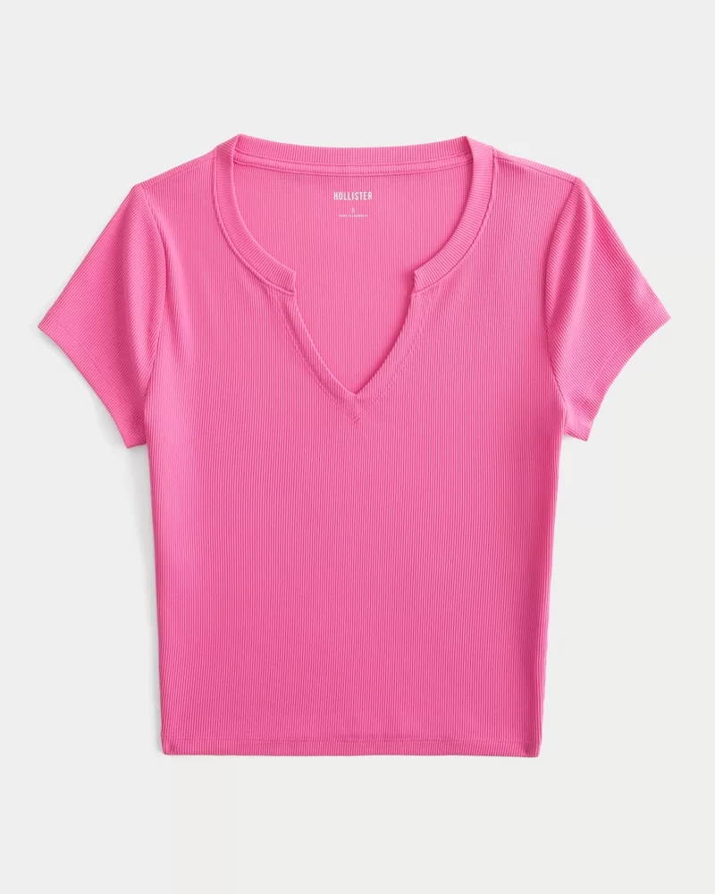 This cute and comfy baby tee is made with super soft ribbed fabric with a seamless look and feel. Short sleeves, notch neckline, slightly shrunken silhouette. Slim Fit.