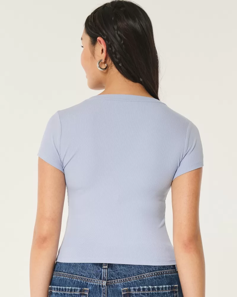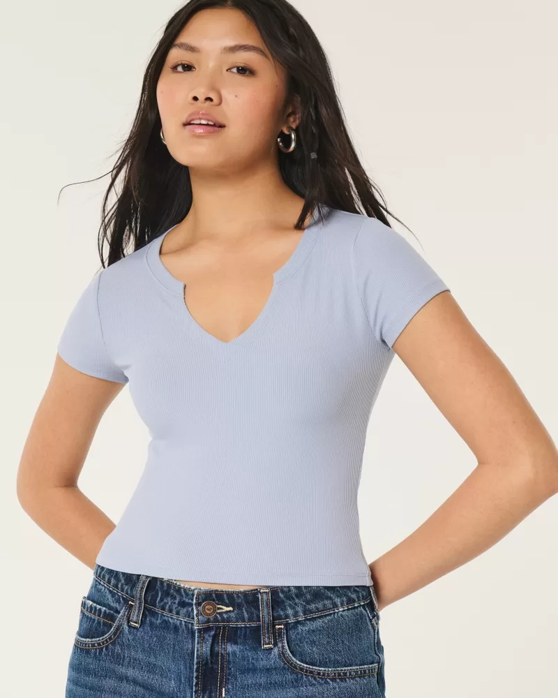 This cute and comfy baby tee is made with super soft ribbed fabric with a seamless look and feel. Short sleeves, notch neckline, slightly shrunken silhouette. Slim Fit.