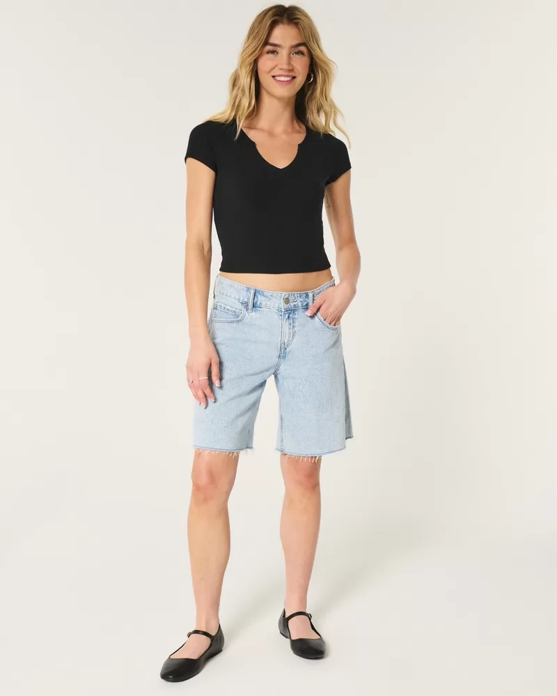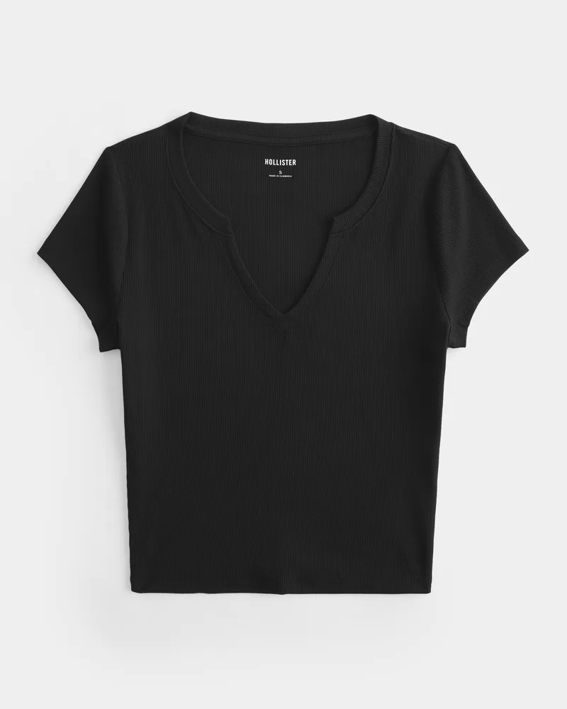 This cute and comfy baby tee is made with super soft ribbed fabric with a seamless look and feel. Short sleeves, notch neckline, slightly shrunken silhouette. Slim Fit.
