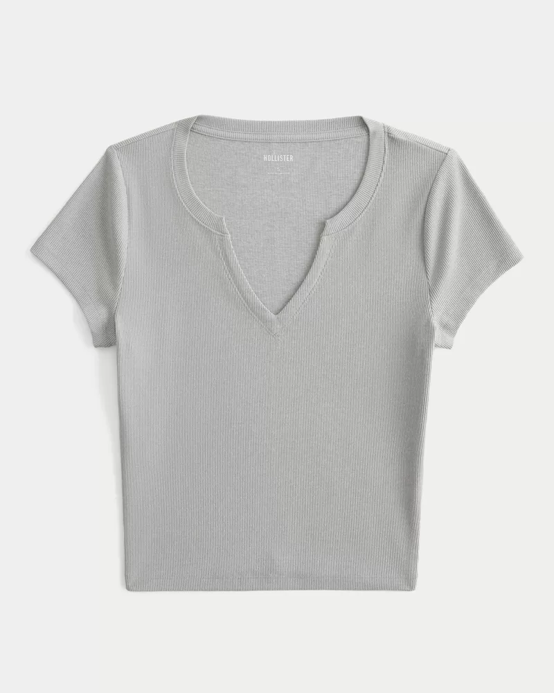 This cute and comfy baby tee is made with super soft ribbed fabric with a seamless look and feel. Short sleeves, notch neckline, slightly shrunken silhouette. Slim Fit.