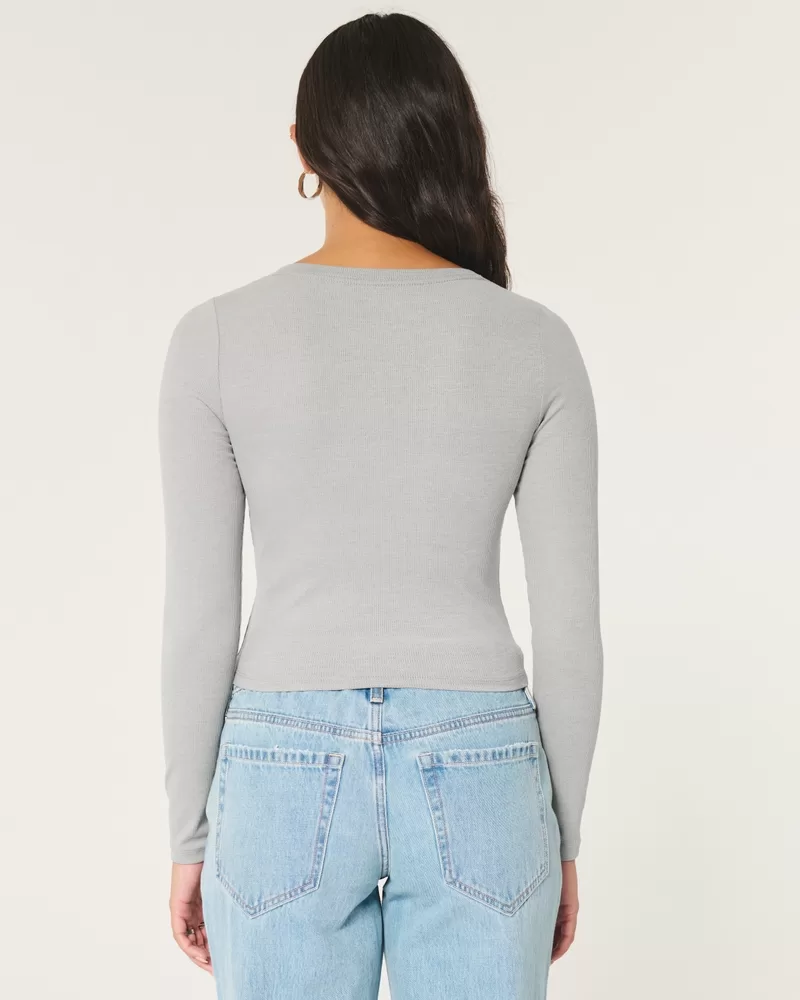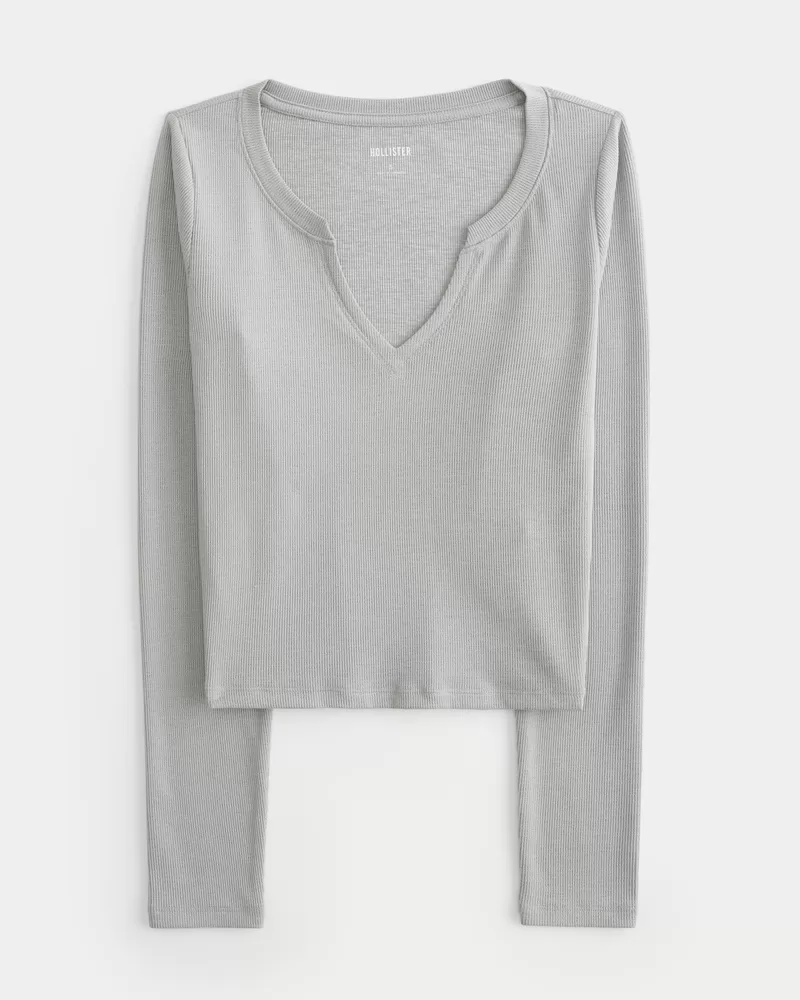 A cute and comfy top in super soft ribbed fabric with a seamless look and feel. Notch neckline, long sleeves. Slim Fit. Imported.