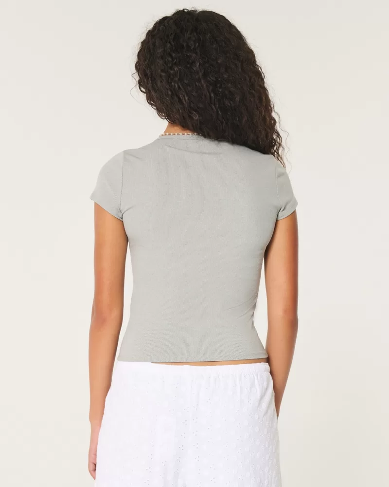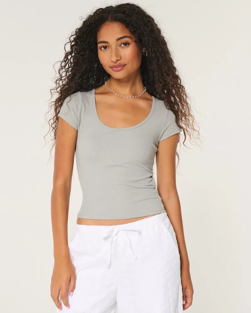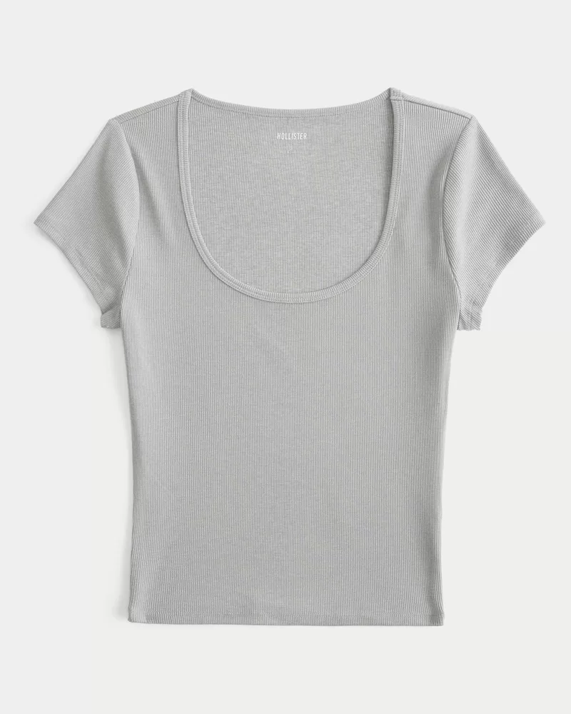 This cute and comfy baby tee is made with super soft ribbed fabric with a seamless look and feel. Short sleeves, scoop neckline. Slim Fit.