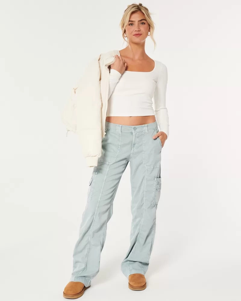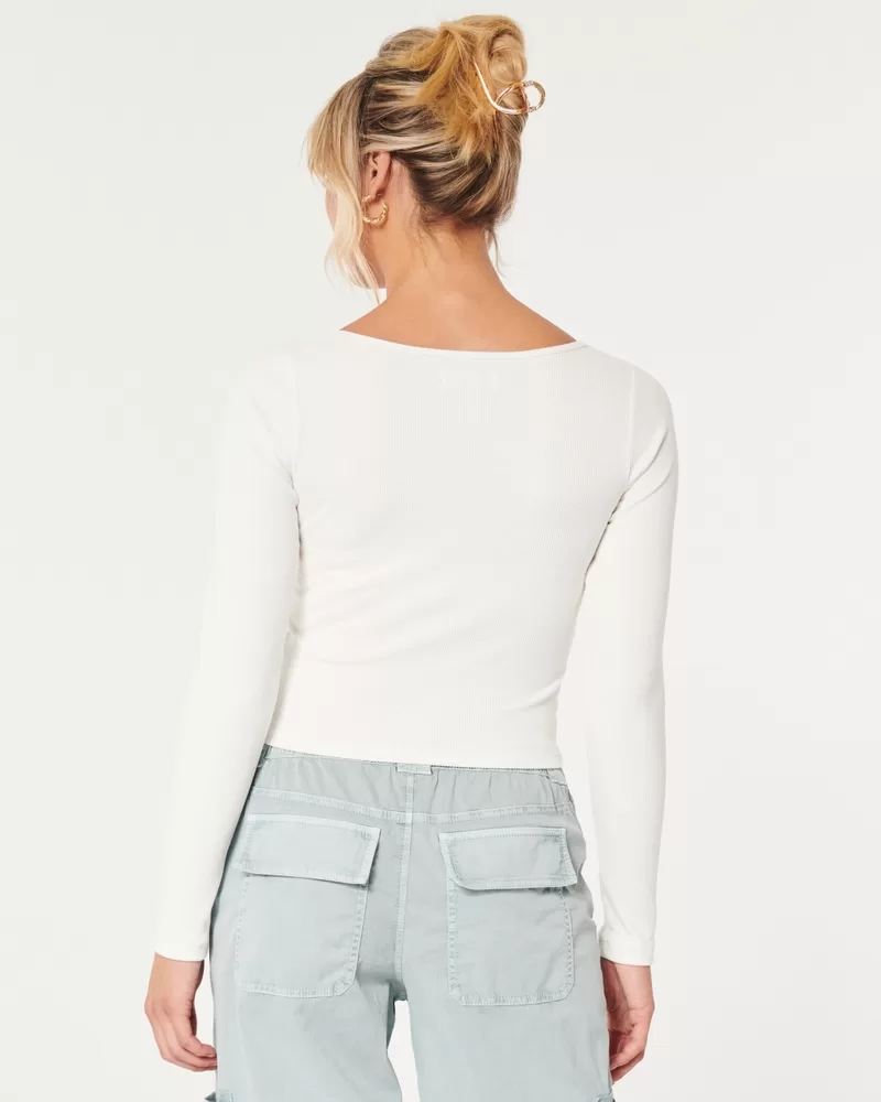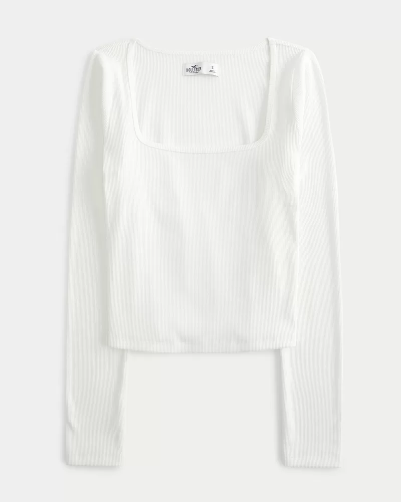 A cute and comfy long-sleeve top made with super soft ribbed fabric with a seamless look and feel. Square neckline. Slim Fit. Imported.
