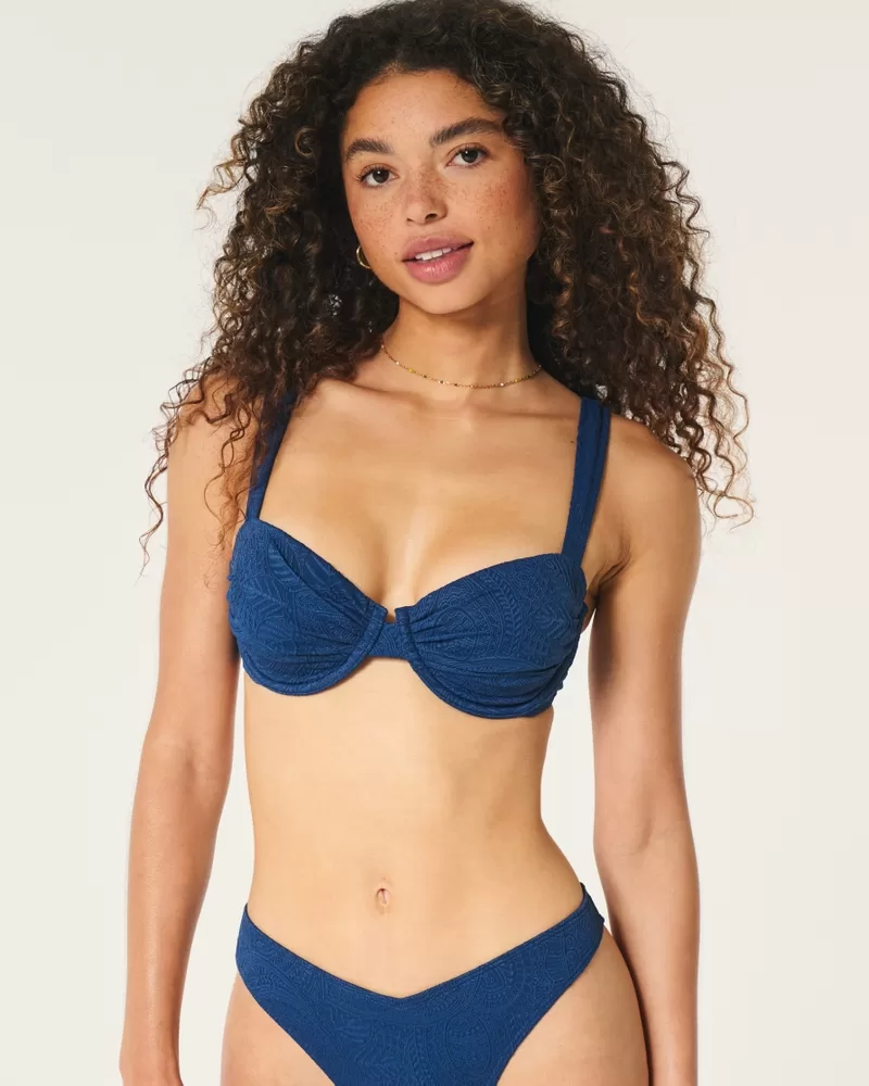 This cute bikini top is made with soft jacquard swim fabric and features underwire for support, adjustable shoulder straps and a flattering balconette silhouette. Swan hook closure, ruched detailing. Removable pads. Imported.