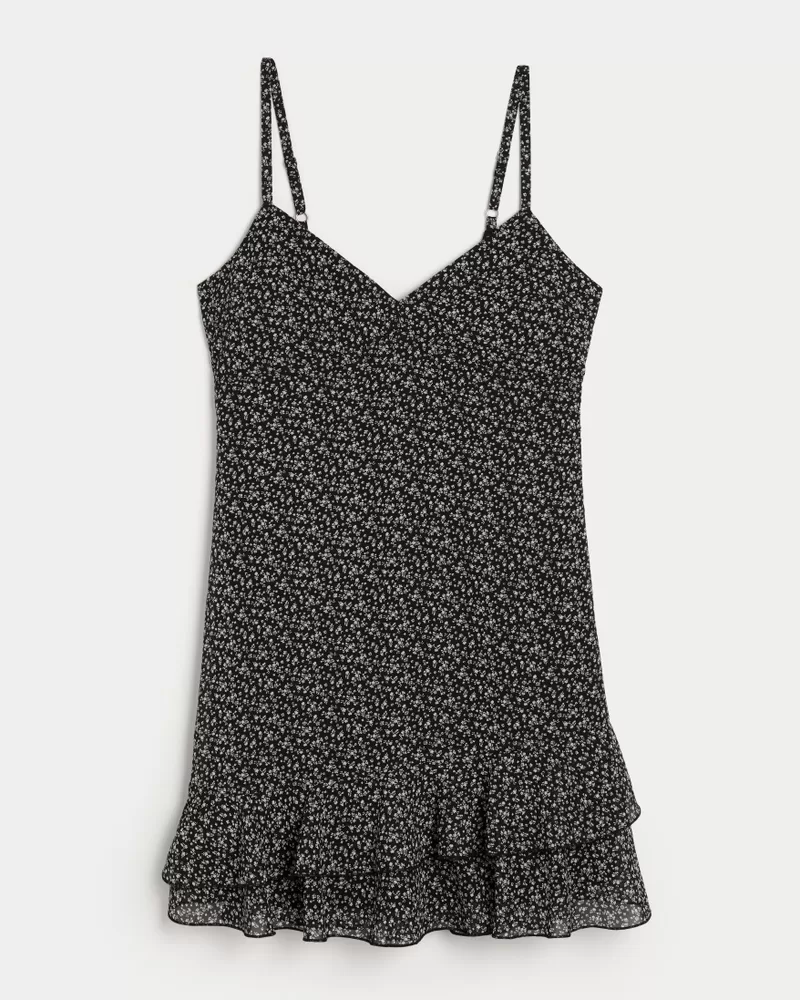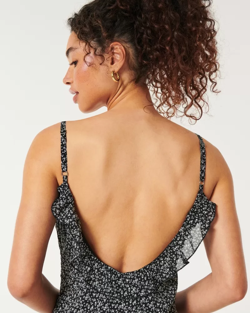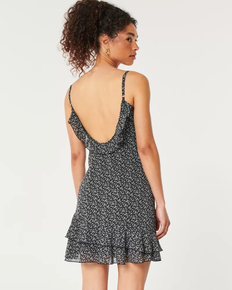 A super cute and ultra-soft v-neck chiffon dress with low back and ruffle tiers. Adjustable straps, removable pads. Imported.