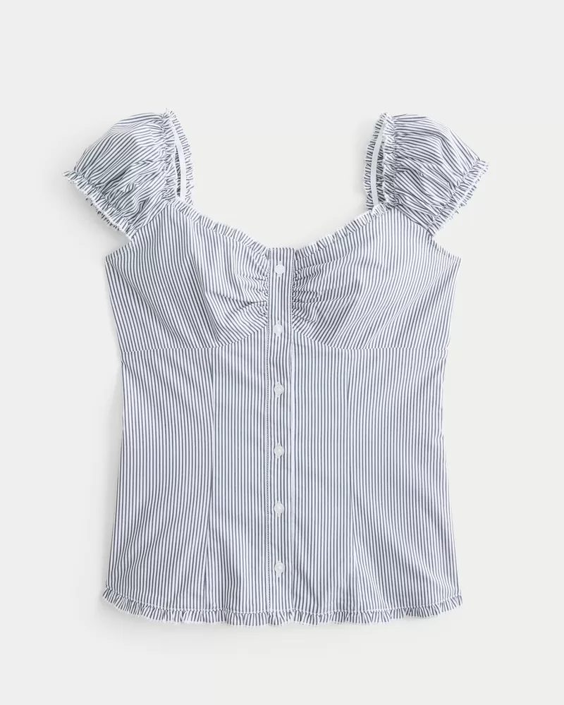 Looks perfect dressed up or down! This pretty Y2K-inspired blouse is made with soft poplin fabric and features ruffled trim and cap sleeves. Smocked back, buttons. Slim Fit. Imported.