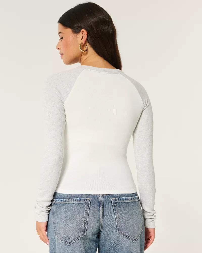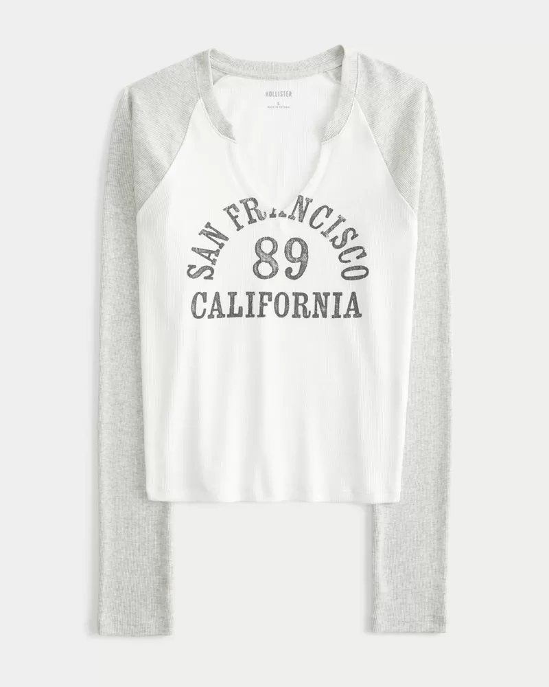 A cute and cozy baby tee featuring a San Francisco California print graphic and notch neckline. Long sleeves. Slim Fit. Imported.
