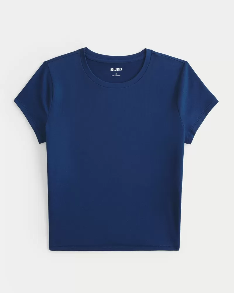 A comfy baby tee made with soft stretch fabric with a seamless look and feel. Crew neckline, short sleeves, longer length. Slim Fit.