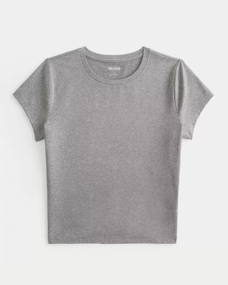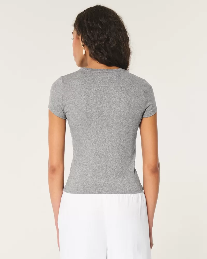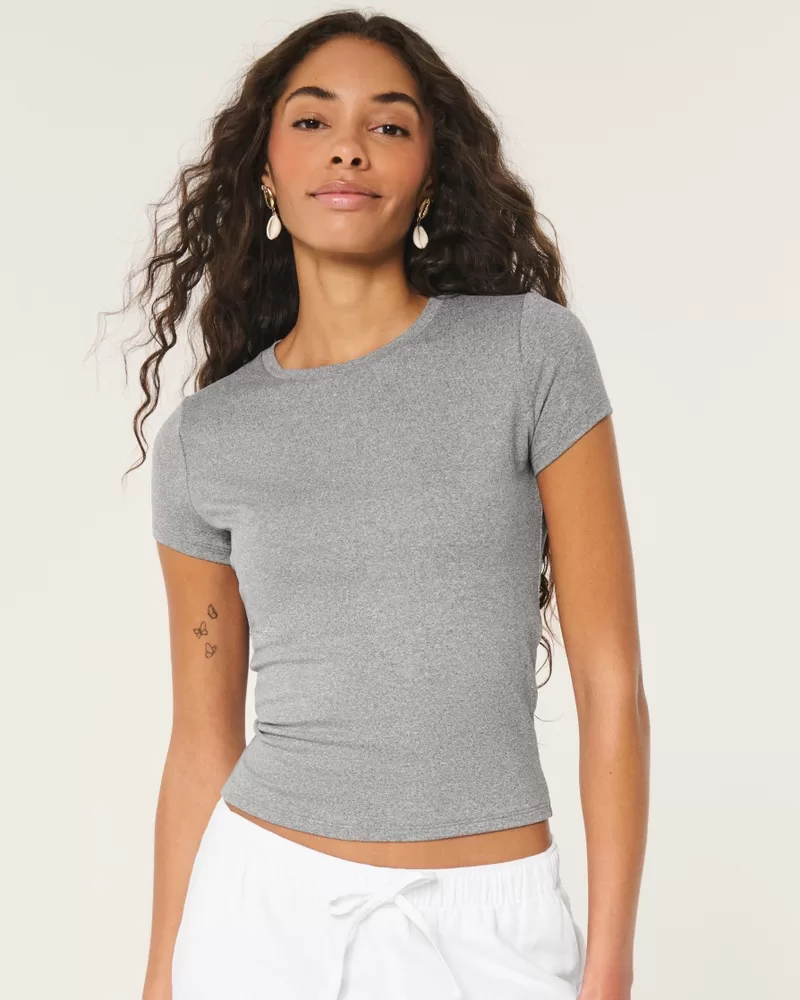 A comfy baby tee made with soft stretch fabric with a seamless look and feel. Crew neckline, short sleeves, longer length. Slim Fit.