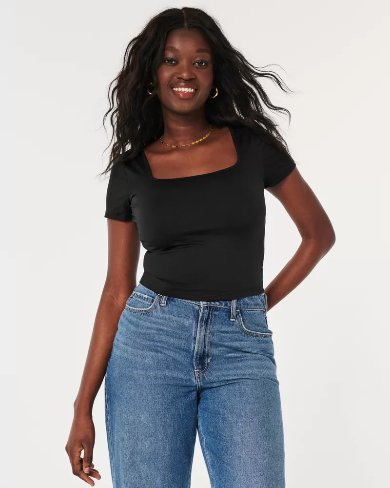 This ultra-cute baby tee is made with super soft fabric with a seamless look and feel. Featuring a flattering square neckline and short sleeves. Slim Fit. Imported.