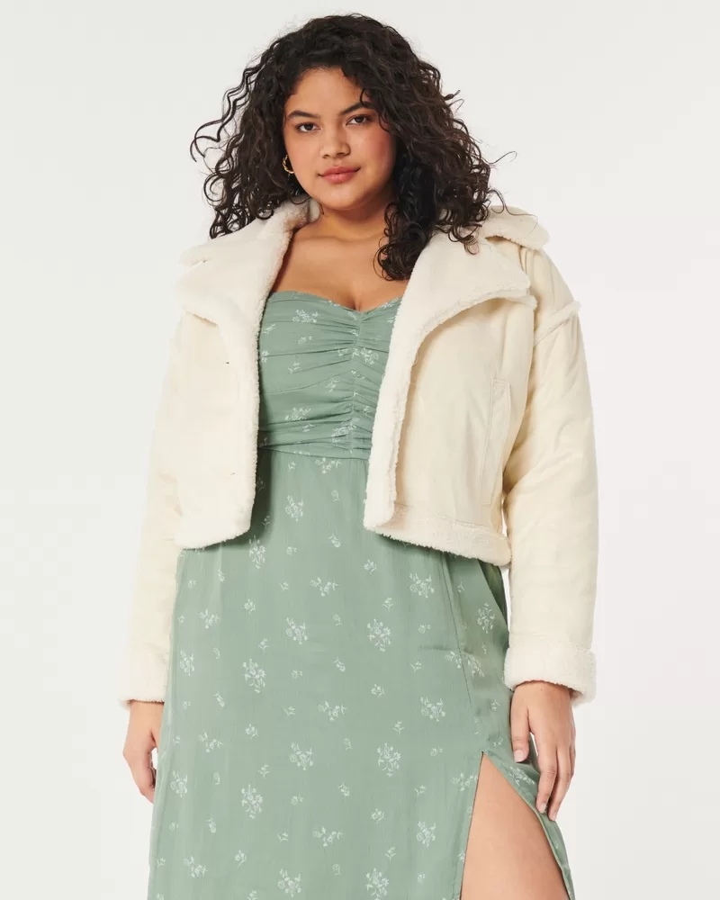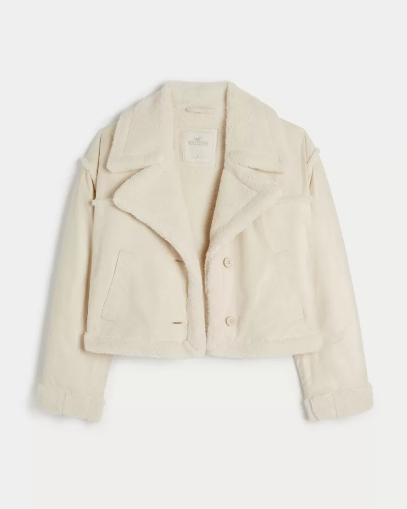 Sherpa-Lined Faux Suede Crop Biker Jacket