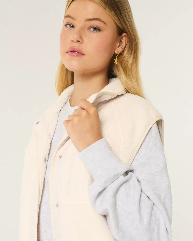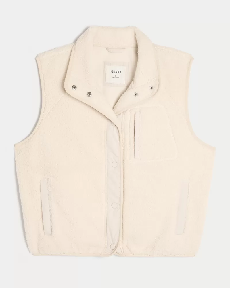This cozy vest is made with super soft sherpa fabric and features a full snap closure. Left chest pocket, front pockets, interior phone pocket. Imported.