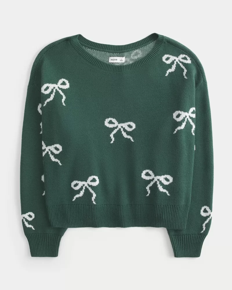 Cozy and super soft, this sweater features all-over bow intarsia graphics and a relaxed neckline that can be worn off one shoulder. Cute slouchy silhouette, long sleeves. Easy Fit.