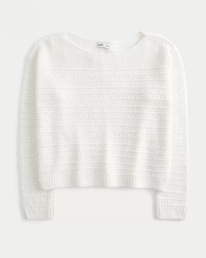 Unbelievably comfy and super soft, this sweater features stitchy texture and a slouchy off-the-shoulder neckline. Long sleeves. Easy Fit.