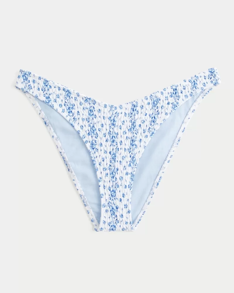 A cute and comfy bikini bottom in soft smocked swim fabric, designed with a flattering high-leg silhouette and cheeky coverage. V-waist. Imported.