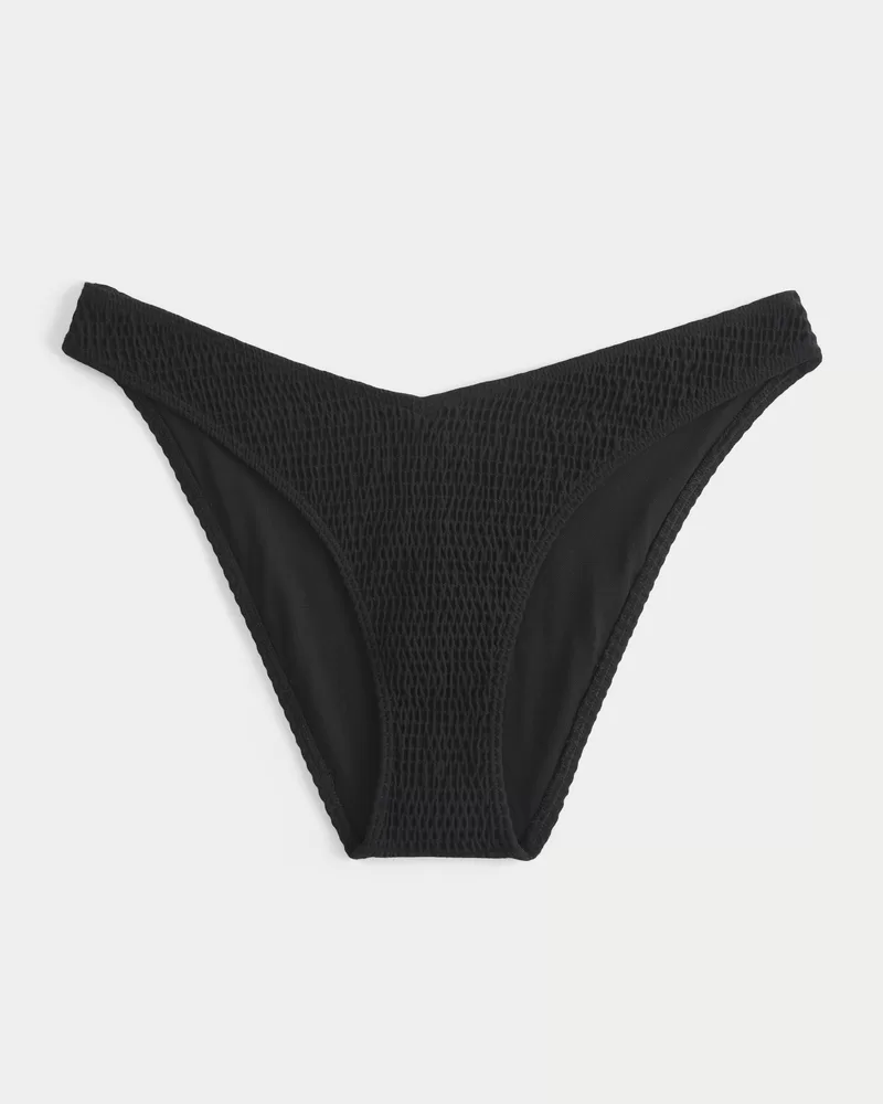 A cute and comfy bikini bottom in soft smocked swim fabric, designed with a flattering high-leg silhouette and cheeky coverage. V-waist. Imported.