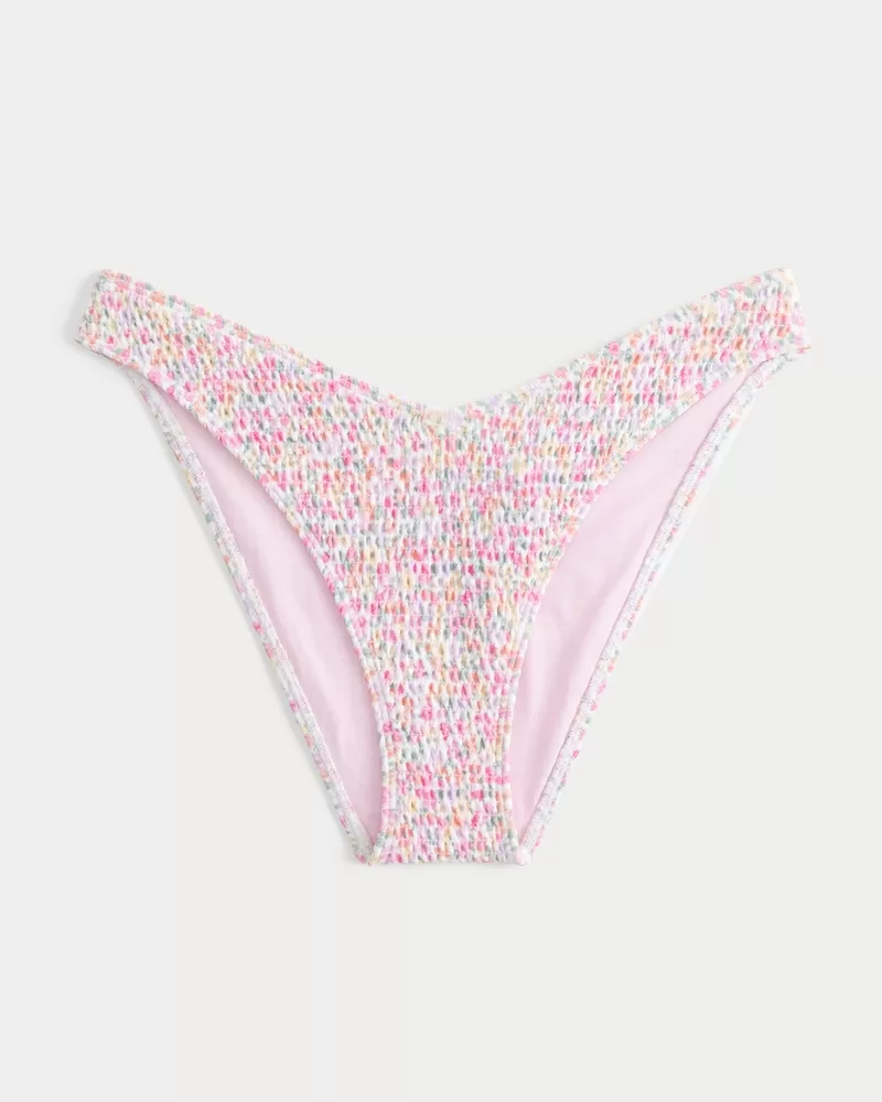 A cute and comfy bikini bottom in soft smocked swim fabric, designed with a flattering high-leg silhouette and cheeky coverage. V-waist. Imported.