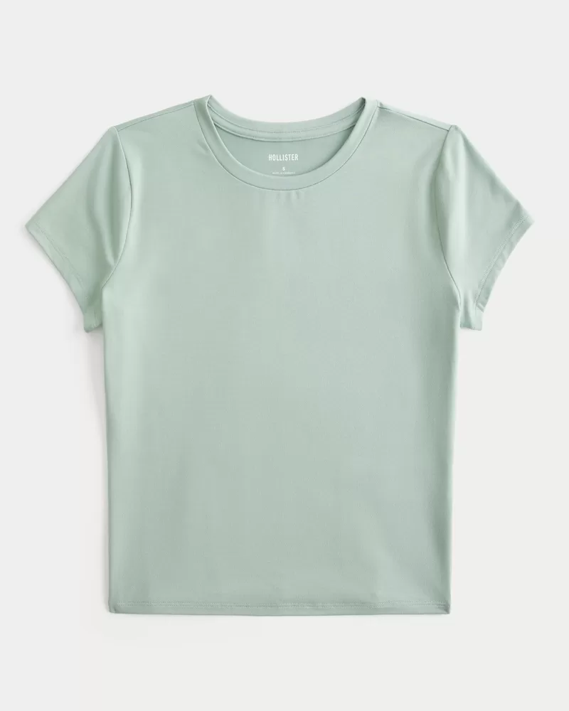 This cute and comfy baby tee is made with soft stretch fabric with a seamless look and feel. Longline silhouette, crew neckline, short sleeves.