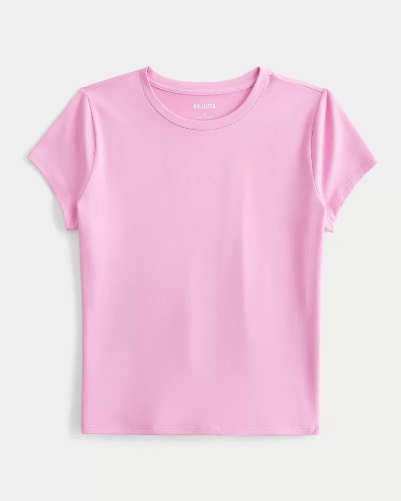 This cute and comfy baby tee is made with soft stretch fabric with a seamless look and feel. Longline silhouette, crew neckline, short sleeves.