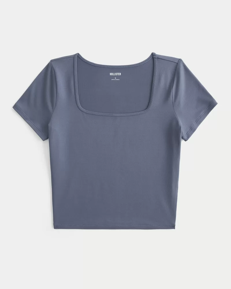 A cute and cozy baby tee in soft stretch fabric with a seamless look and feel. Designed with a slightly shrunken silhouette, square neckline and short sleeves. Slim Fit. Imported.
