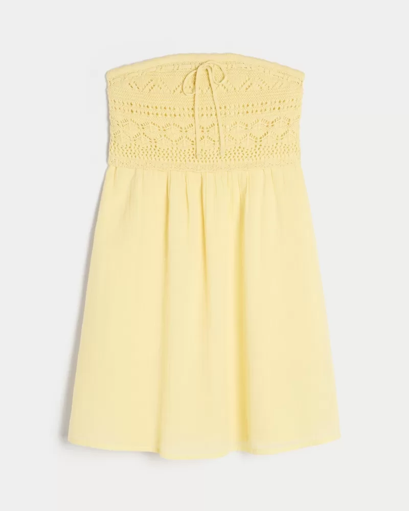 Flowy and super soft, this dress features a crochet-style bust with tie along the neckline. Drapey skirt, pockets. Imported.