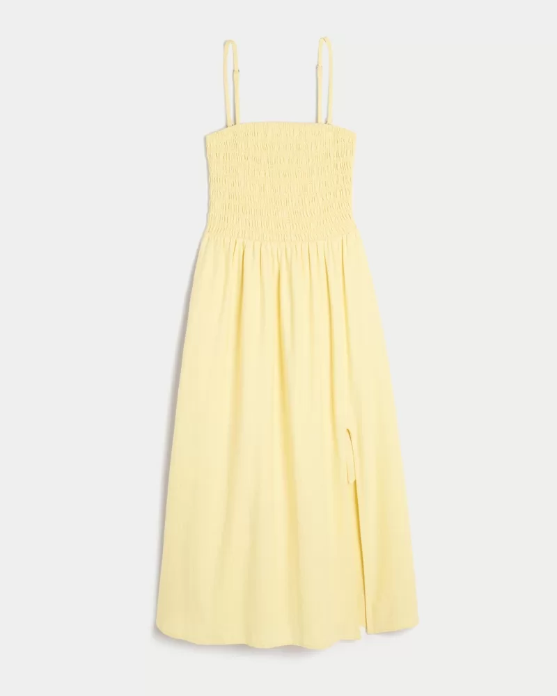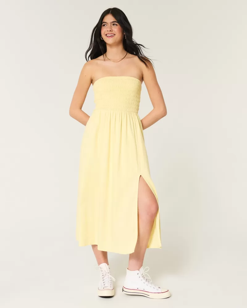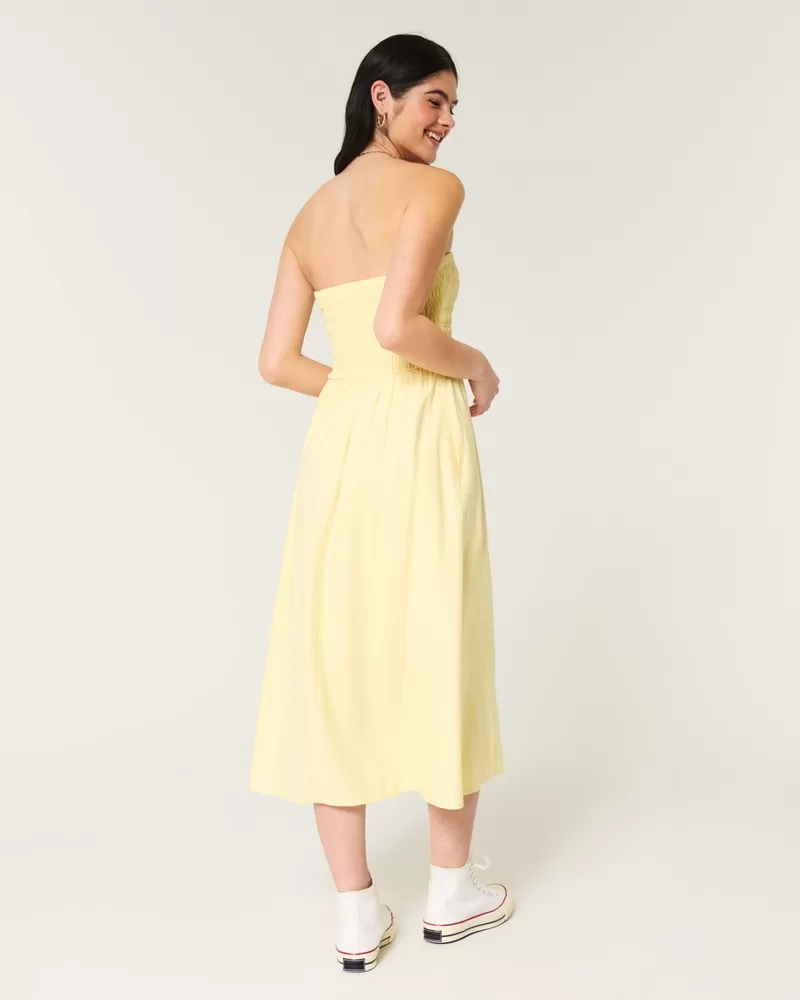 This easy throw-on-and-go strapless dress is designed with a soft smocked bust and midi length. Split hem detail, soft linen-blend fabric, pockets. Imported.
