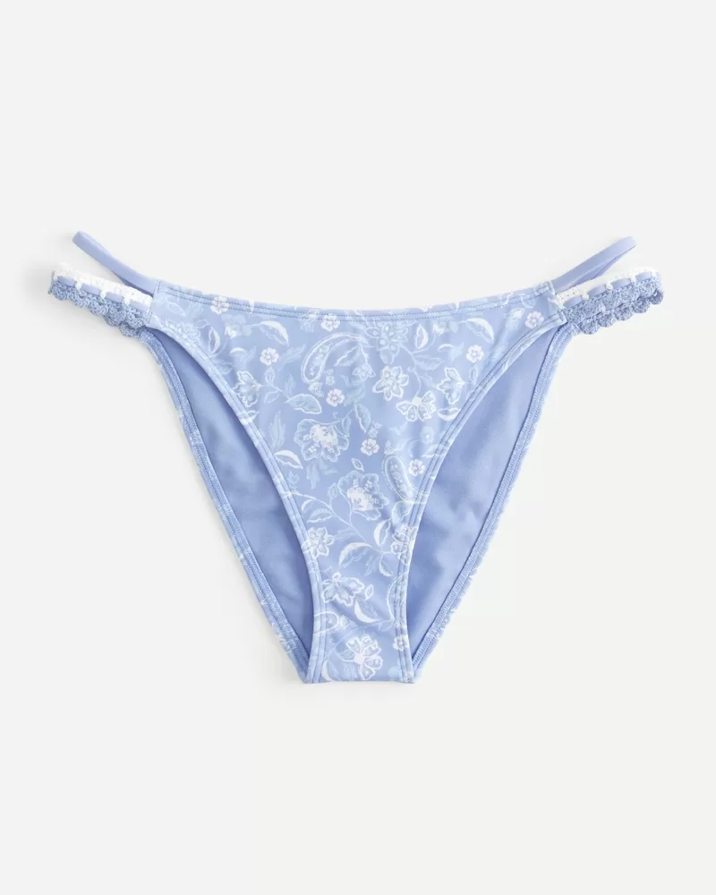 A pretty bikini bottom in soft crochet-style swim fabric. Strappy sides, high-leg silhouette, cheeky coverage. Imported.