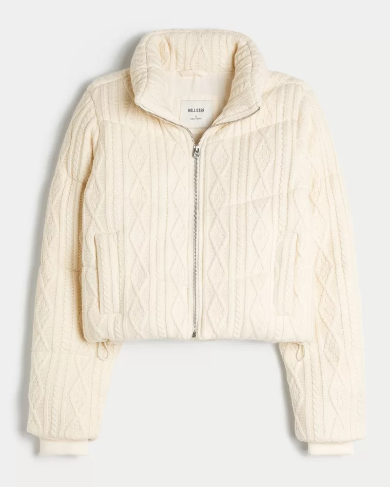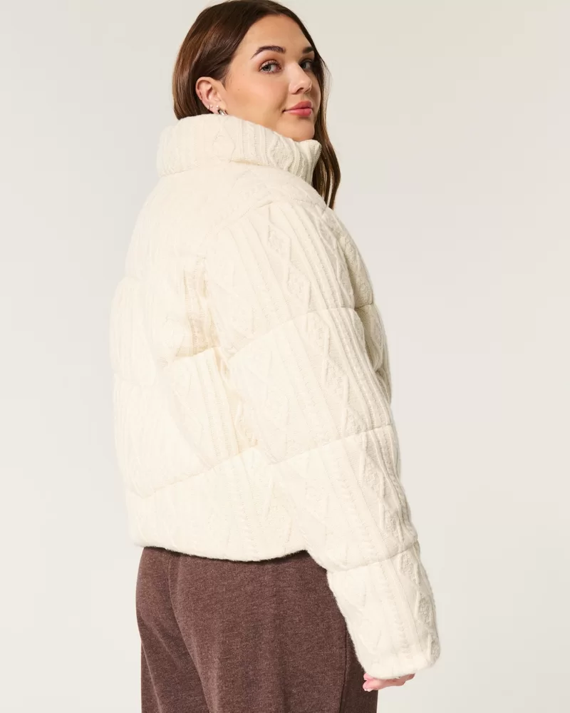 This cute and cozy mini puffer jacket is made with soft sweater-knit fabric with cable-knit patterns and quilted channels. Full zip-up closure, mock-neck collar, pockets, drawcord hem, fully lined, ribbed cuffs. Imported.