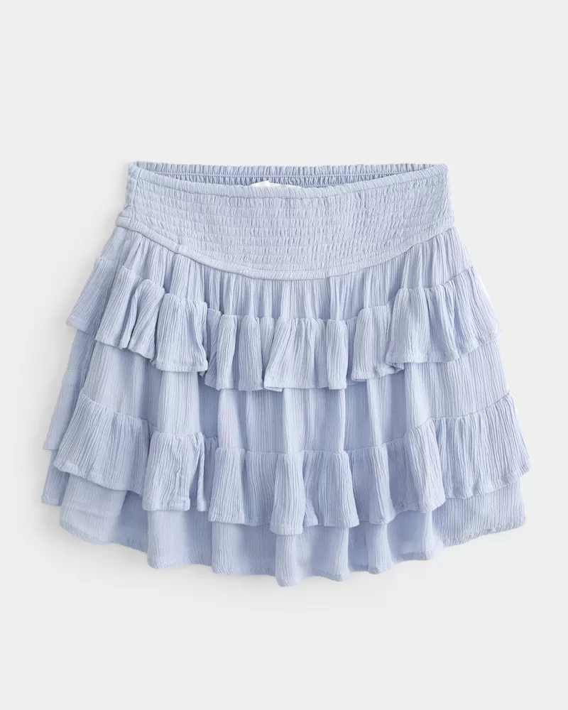 A super soft and pretty mini skort with ruffled tiers and a soft smocked waist. Hidden knit shorts, pocket, ultra high-rise waist. Imported.